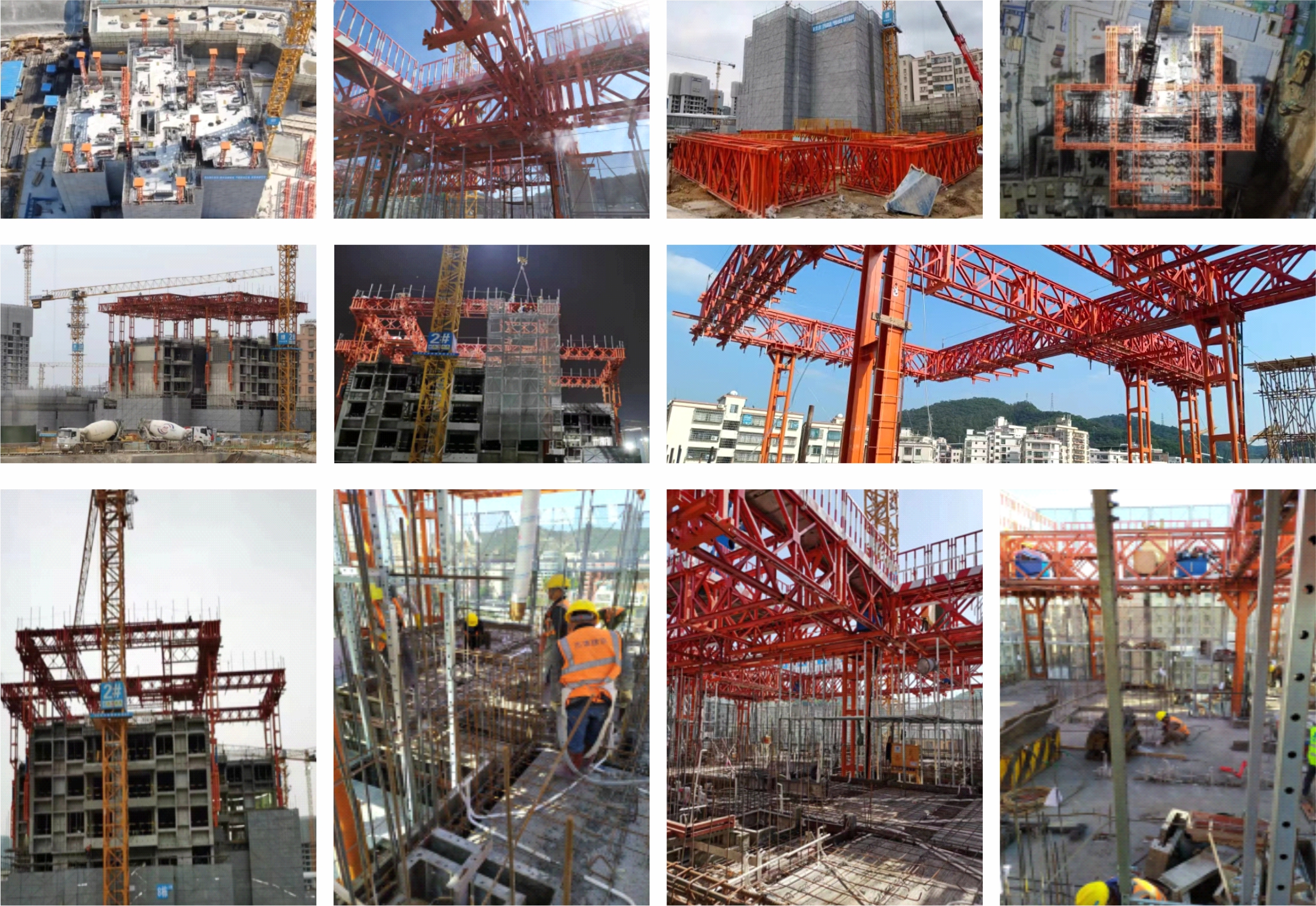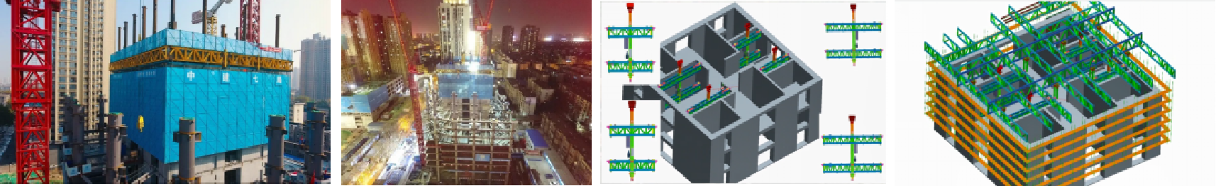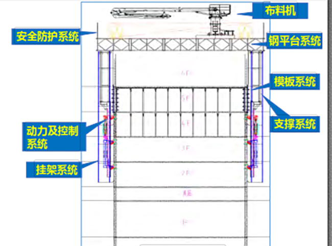 由頂部平臺(tái)及鋼桁架系統(tǒng)、“懸掛式”支撐及液壓頂升系統(tǒng)、電控系統(tǒng)、內(nèi)外掛架系統(tǒng)、模板系統(tǒng)五大系統(tǒng)以及全過程安全防護(hù)系統(tǒng)組成。屬于少支點(diǎn)大型程油缸支撐系統(tǒng),液壓油缸驅(qū)動(dòng)的支撐主立柱懸臂坐在下層墻體及下下層墻體上。上采用輕量化設(shè)計(jì)理念。具有構(gòu)件輕,自重小,承載力強(qiáng),集成能力強(qiáng),電梯直達(dá)平臺(tái)。頂升、安拆、施工速度快。操作更方便,增加可靠性,降低風(fēng)險(xiǎn)。我們前期的項(xiàng)目,基本上采用這種“懸掛式”智能建造機(jī),比如長沙三角洲北辰項(xiàng)目、西安榮民金融中心項(xiàng)目等。