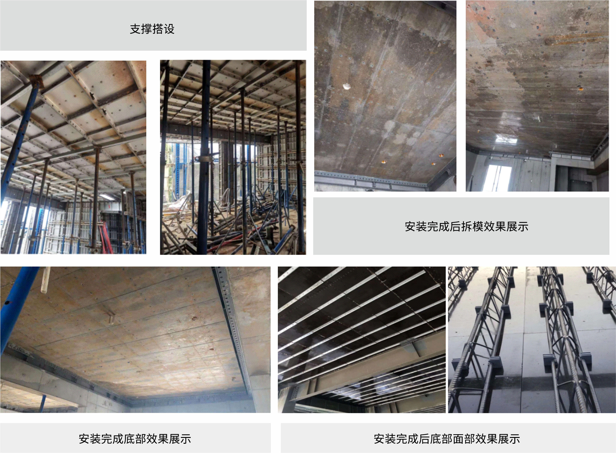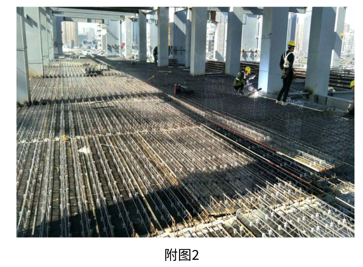 裝配可拆式鋼筋桁架樓承板,實際案例(龍湖集團浙江公司紫荊港項目)6-7 人一天可鋪裝1000㎡(見附圖二),可有效縮短工期比自承式樓承板的安裝 快百分之三十的速度,拆除比較方便,1400㎡ 的板面6人一天即可拆除完畢。