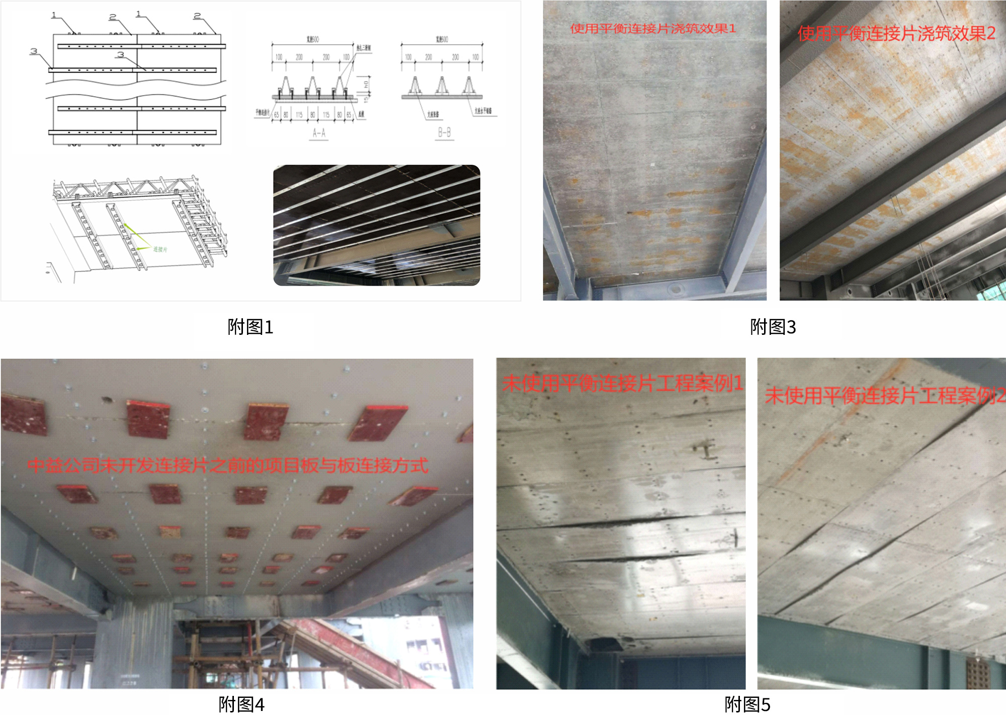 可拆式樓承板原來鋪裝完成后,在沒有連接片的時候采用的是下面用模板打 自攻螺絲,使板與板之間連接成一個整體平面(見附圖四),這樣的施工效 率低下,成本高, 澆筑后質(zhì)量不能保證,這是某公司無連接片澆筑混凝土后 的效果見(附圖五),所以自從中益/泰博的裝配可拆式鋼筋桁架樓承板的底 部連接片技術(shù)開發(fā)以后(中益/泰博自主研發(fā)的專利技術(shù)),底部每 400mm間 距的有一檔平衡連接片(見附圖一)交叉錯位連接,防止了板與板之間的錯位 ,使得板面之間能成為一個平面,保證了樓板底部的平整度,并且提高了施 工速度,質(zhì)量做到無需二次抹灰,可直 接移交裝修。(見附圖三)