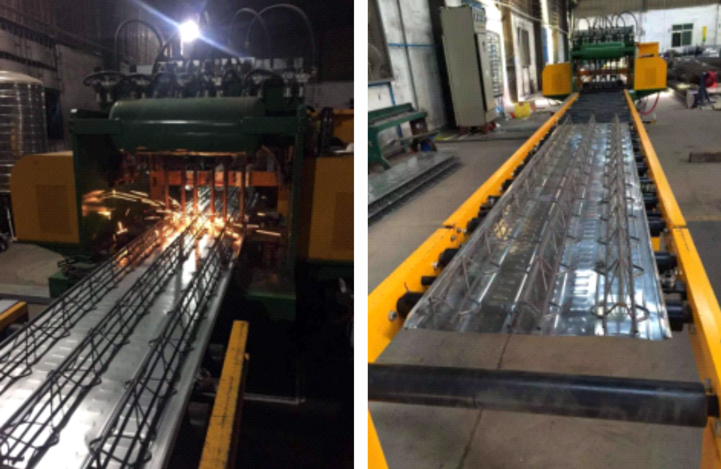 鋼筋桁架樓承板是將樓板中的鋼筋在工廠采用進口設(shè)備加工成為鋼筋桁架,并將鋼筋桁架與鍍鋅板在工廠焊成一體的組合樓承板。在施工階段,鋼筋桁架樓承板可承受施工 荷載,直接鋪設(shè)到梁上,并進行簡單的鋼筋工程,便可澆筑混凝土。由于完全取代了模板功能,減少了模板架設(shè)和拆卸工程,大大提高了樓板施工效率。